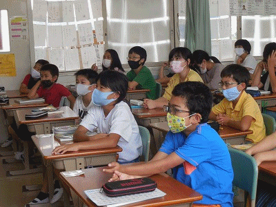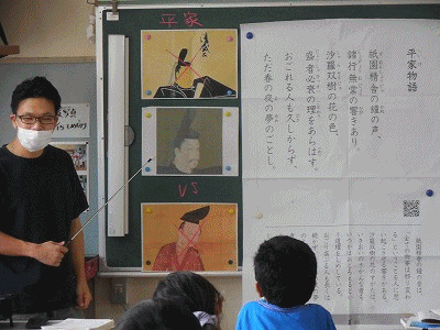 「古典の世界」の単元です。「平家物語」や「竹取物語」の冒頭を読んでみました。「平家物語」の背景となる歴史的なトピックスを、担任の先生が熱く語ります。6年生で学習する日本の歴史の勉強が楽しみになりました。