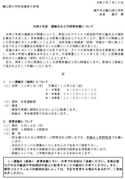 先週配布しましたが、新型コロナウイする感染予防のため、今年度の運動会および2学期授業参観について、以下のように変更します。ご理解、ご協力をよろしくお願いします。なお詳細については、後日ご連絡いたします。