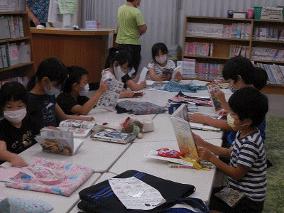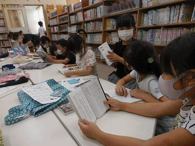 夏休み用の図書として、一人2冊まで、本が借りられます。どの本を借りようかな……?いろいろ見て探します。せっかくの夏休みです。ぜひたくさんの本を読んでほしいと思います。