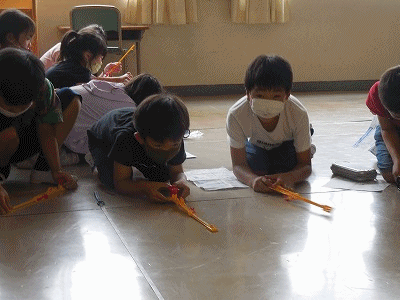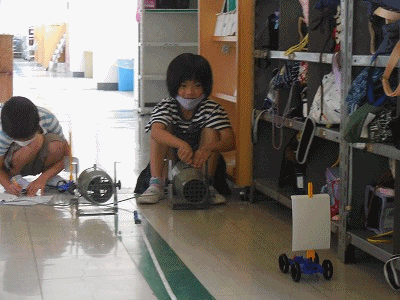 「風やゴムで動かそう」の単元です。実験キットを使って、ゴムや風で動く車を作りました。さっそく廊下や教室で走らせました。とても楽しい実験です。