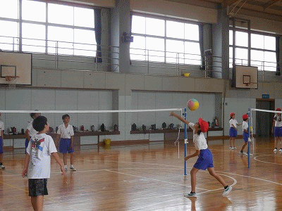 バレーボールの学習です。チームメイトが手で投げ上げたボールをアタックするところから始まります。順番に交代しながらアタックしていきますが……なかなか難しい!それだけに、うまく決まったら歓声が上がります。