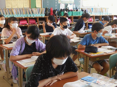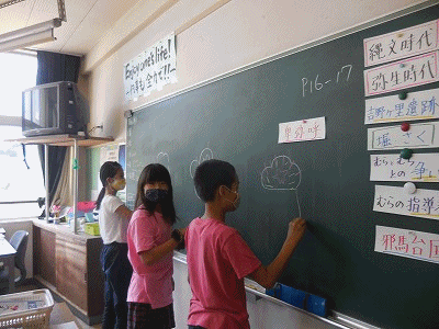 卑弥呼の似顔絵を描いた後は、古墳の学習です。前方後円墳……幡山西小学校の近くにもあります。本地大塚古墳……知ってるかな?