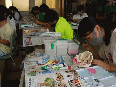 「水の流れのように」の仕上げ段階に入っています。青い粉を粘土で作った器の中に配置していきます。器にも好きな色を塗って、きれいなオブジェが完成します。