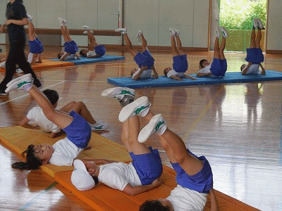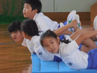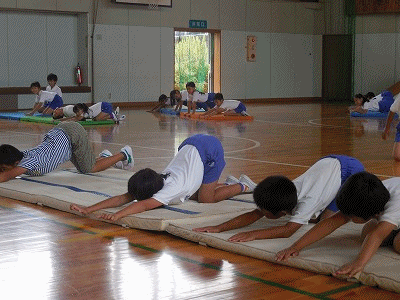 マットを使っての準備運動、ストレッチです。しっかり体を伸ばしてから肩倒立に挑戦です。しっかりタワーが立ち上がりました。