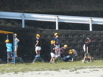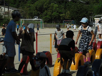 日差しは強いものの、日陰はひんやりと過ごしやすいです。最近の人気はドッジボールとタイヤ跳び。一輪車も根強い人気です。リレーを練習する姿も見られます。