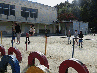 ハードル走に挑戦です。間隔の違う4コースに分かれて、繰り返し跳んで行きます。さすが6年生、スムーズに跳べている子が多いです。