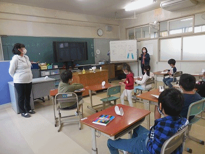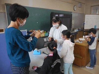 「おきあがりりこぼし」を作ります。紙コップの中に栗を固定して、ふたと底に向きをそろえて、好きな絵を描いた楕円の紙を貼ります。かわいい「こぼし」が完成しました。