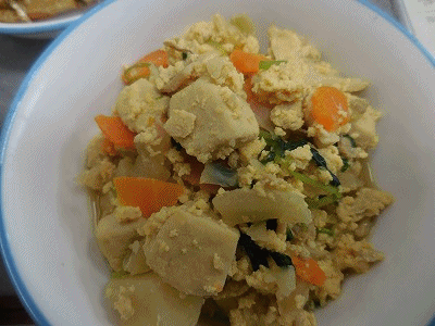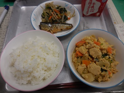 献立は、ごはん・牛乳・高野豆腐の卵とじ・いわしの梅煮・ほうれんそうのおひたしです。いわしは脂がのっていてとても美味しかったです。職員室の給食のあまりも、2クラスで分けっこして持っていきました。
