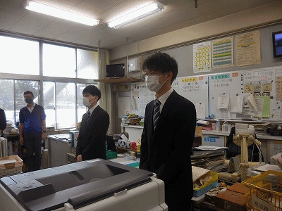 6年1組配属の加藤智晴(ちはる)先生、3年1組配属の佐々木豪巳(たけみ)先生です。職員室で自己紹介をしていただきました。2週間、しっかり勉強してほしいです。