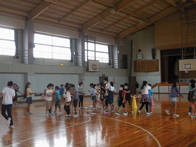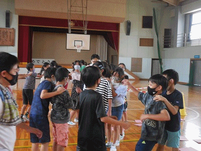 キャンプファイヤーの練習で体育館に来ました。スタンツ練習の前に、まずは楽しいジャンケン列車……大きな1列の列車が出来上がり、とても盛り上がりました。