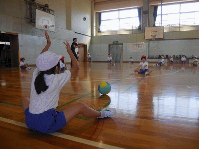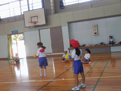 こちらもボールを使った運動です。ボールを上へ投げ上げ、床に手をついてから素早くキャッチします。なかなかまっすぐ上へボールを投げられない子が多くてびっくりです。これも日頃の遊びで身に付けていく能力です。がんばれ!