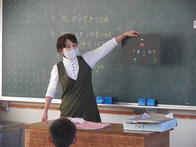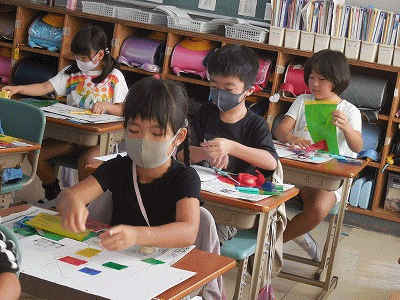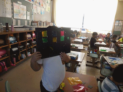 「ひかりのプレゼント」の作品作りです。集中して隙間なくセロファンを貼っていきます。今日みたいに日差しがきれいな時に飾りたいですね。がんばれ!