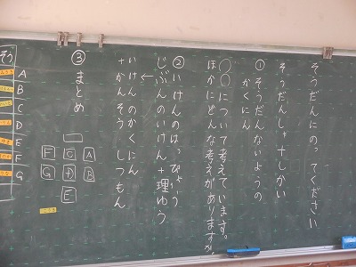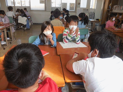 「そうだんにのってください」の単元です。各班で相談に乗ってほしいことを話し、みんなでいいアイデアを出し合います。授業だけじゃなくて、日常的に相談したりされたりすることをどんどんしてほしいと思います。