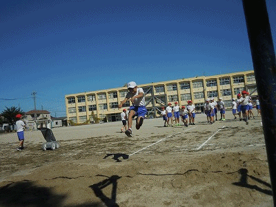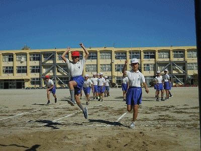 走り幅跳びに挑戦です。足を合わせ、高くジャンプします。ジャンプしたときの上体の使い方がポイントです。