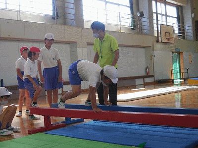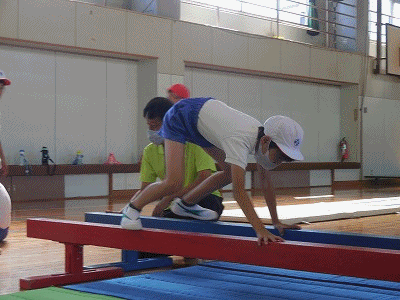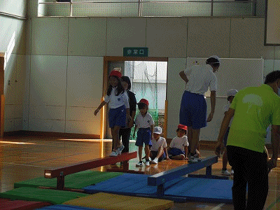 平均台を使って、後ろ向きに歩いたり、手足を使って前へ進んだりします。バランスと手足の使い方のトレーニングです。最後にマット目がけてジャンプ!きれいなフィニッシュが決まりました。