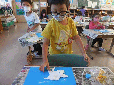 「でこぼこはっけん」の作品に取り掛かります。紙粘土に凸凹の模様をつけて、磁石を埋め込んで飾りにします。さあ、どんな形にしようかな?