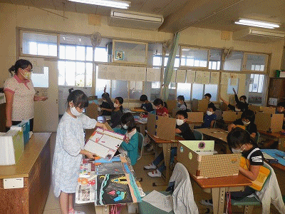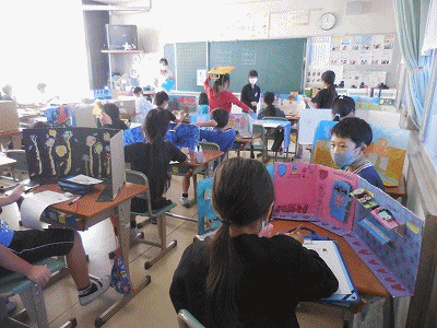 「パタパタひらいて」の作品が完成しました。作品カードを書いて、いっしょにみんなに見てもらいます。お互いの作品でいいところ・工夫してあるところをぜひたくさん見つけてほしいと思います。