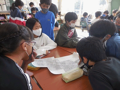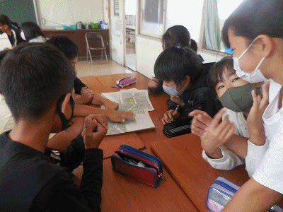 京都の清水坂で、どんなお土産をどのお店で買おうか、班で相談中です。地図を見ながら、計画を立てました。気持ちの上では、すでに修学旅行が始まっています。とても楽しい時間です。