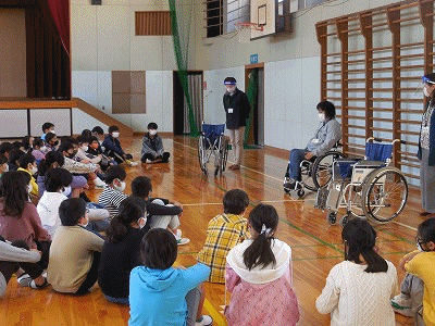 こちらは車いす体験です。いすに座ったま手でこいで進める車いす、楽なようでとても危険で大変なことを、話を聞いたり実際に自分で操作したりして初めて理解できました。こうした車いすを利用する方々が安心して出かけられる道路や町、社会について、しっかり学ぶことができました。