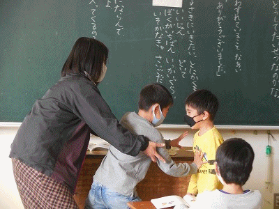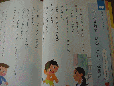 「わすれていること、なあい」の資料を使って、きちんとあいさつをすることの大切さを学びます。役割演技で、列に割り込む子、嫌がって押す子の役をみんなの前でしました。このあと互いに何て言うべきかな?