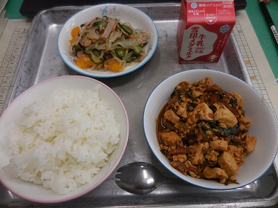 献立は、ごはん・牛乳・マーボー豆腐・中華あえです。マーボー豆腐はボリュームがあって、味もごはんにピッタリで、モリモリ美味しくいただきました。
