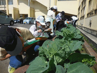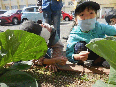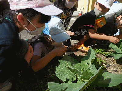 キャベツ畑で、モンシロチョウの卵や幼虫の観察をしました。よく探してみると、キャベツ1株にたくさんの卵や幼虫がついていました。サナギになるころには、キャベツの葉が丸坊主になってしまうことでしょう。