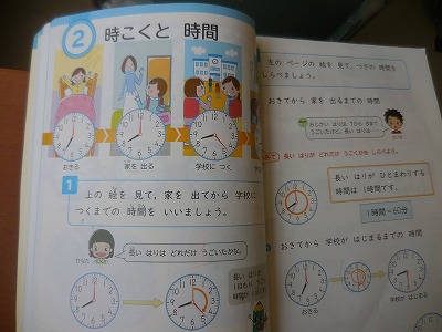 「時こくと時間」の単元です。二つの時刻の間の時間を計算します。アナログ時計を使って数えるとわかりやすいです。