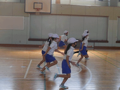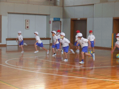 体育館で、いろんなリレーをして楽しみます。やはり競争になると、子どもたちは燃えて頑張ります。すばらしい!