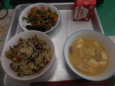 献立は、ひじきごはん・牛乳・いわしの梅煮・いんげんのごまあえです。いわしが脂が乗っていて、骨までやわらかく、とても美味しかったです。モリモリいだきました。