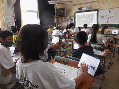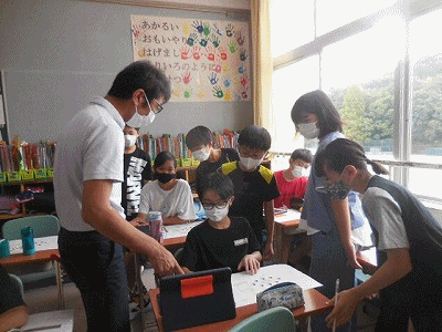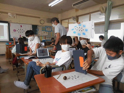 「月の形と太陽」の単元です。ピンポン玉の半分の色を付けて、地球を中心として置き、月の満ち欠けをわかりやすく示しました。タブレットで写真を撮り、どういうときにどういう見え方をするかまとめました。
