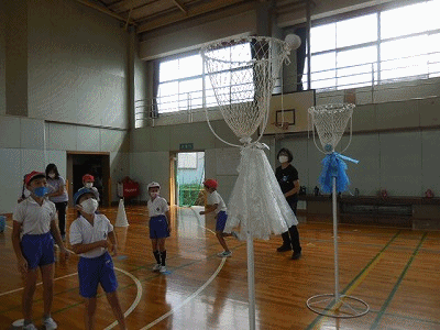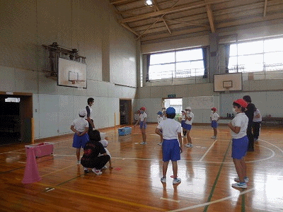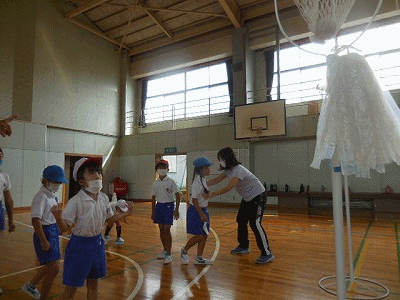 3・4年種目の「ねらえ!ダンクシュート」をみんなでやってみました。狙ってかごに入れるのは大変ですが、練習次第で上手になります。