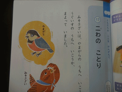 「二わのことり」の資料を読んで考えます。みそさざいはどうしてやまがらのうちに行ったのでしょう?みそさざいになってやまがらに話します。とても優しくて涙が出ています。