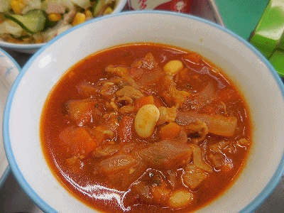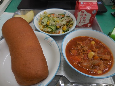 献立は、黒ロールパン・牛乳・ポークビーンズ・フレンチサラダ・リンゴです。ロールパンをポークビーンズに浸して美味しくいただきました。