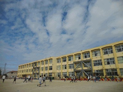 雲が切れてきて、晴れてきました。にぎやかな運動場です。