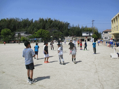 休み時間の様子です。青空の下、運動場では、子どもたちが元気よく遊んでいました。