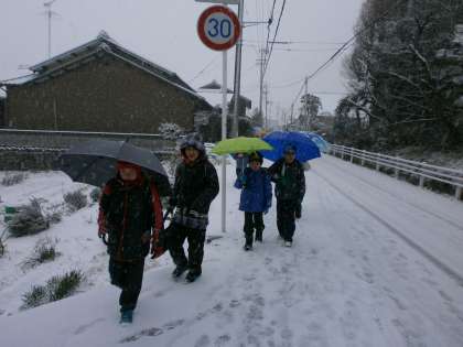 昨夜雪が降って、家の屋根や広場の土の上にうっすら積もっていました。朝、いつもより少し早く学校へ来て駐車場に車を入れる頃からまた降り出し、子どもたちが登校してくるころには辺り一面銀世界になっていました。