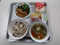 今日の献立は、赤飯、牛乳、じゃがいもののっぺい汁、鶏肉のてりかけ、小松菜の昆布あ...