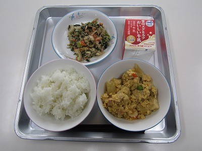 今日の献立は、ごはん、牛乳、凍り豆腐の卵とじ、ちくわと小松菜のごまあえです。