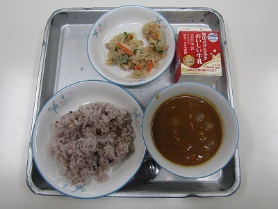 今日の献立は、五穀ごはん、牛乳、ハヤシシチュー、大根サラダです。