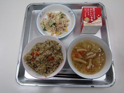 今日の献立は、とりめし、牛乳、じゃがいもののっぺい汁、切干大根サラダです。