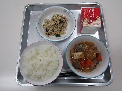 今日の献立は、ごはん、牛乳、新たまねぎと生揚げの煮物、五色あえです。