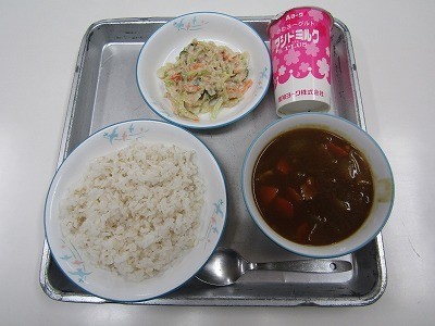 今日の献立は、麦ごはん、発酵乳、カレー、ツナサラダです。
