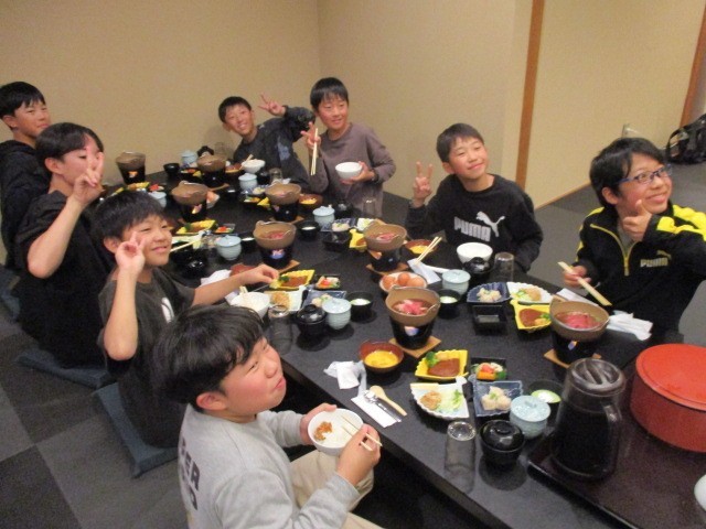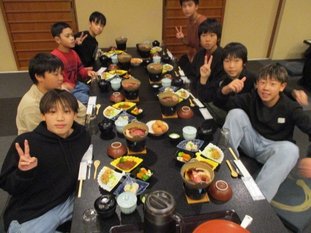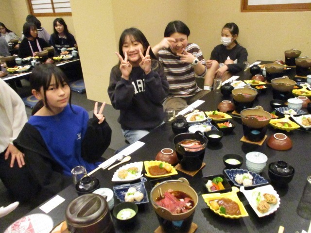 夕食会場のお膳にはところせましとごちそうが並び、すき焼き鍋もぐつぐつとおいしそうに煮えています。