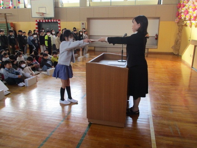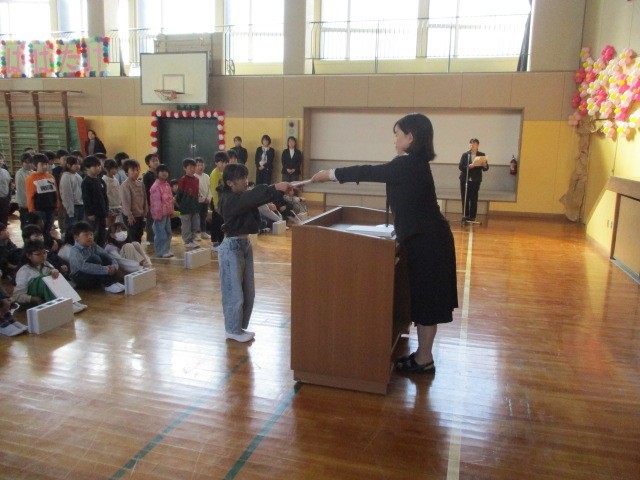 1年生から5年生の修了証を、代表児童を通して渡しました。