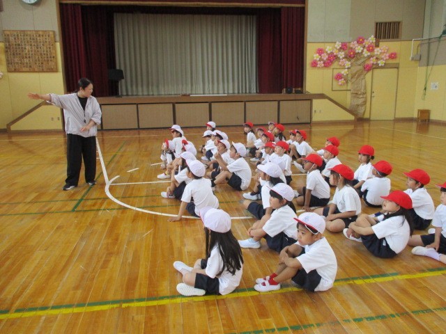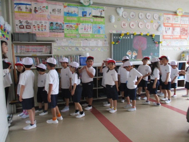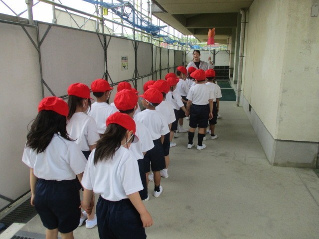 1年生も教室で体操服に着替え、整列して静かに移動するところから学習が始まります。