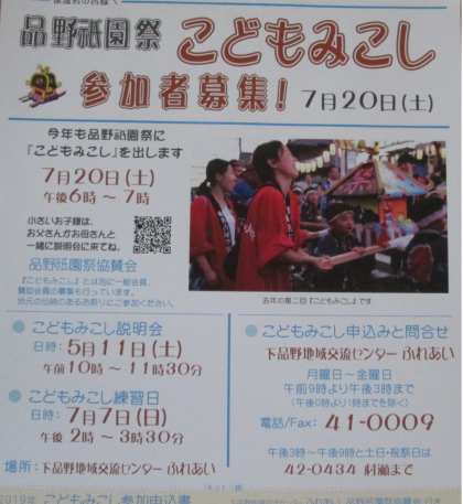 第149回品野祇園祭が7月20日(土)に開催されます。子どもたちもとても楽しみにしています。そこで今年も、「こどもみこし」の参加者を募集しています。参加希望の子は7月7日(日)午後2時から下品野交流センターに来てください。5月11日(土)の説明会に参加していなくても大丈夫です。下品野をあげて地元のお祭りを盛り上げましょう。