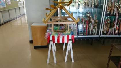 品野中学校の玄関におみこしがありました。来月の品野祇園祭に使う子どもみこしです。作り手は品野中学校の生徒たち、かつぎ手は下品野の子どもたち。多くの子どもたちの参加を待っています。