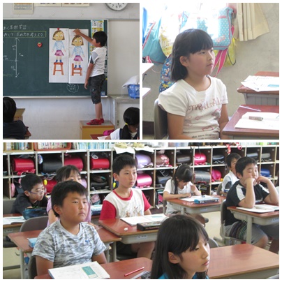 2つ条件のある文章題。いろいろと考えます。そして、考えたことをみんなにわかってもらおうと説明します。その説明に工夫があり、さらに学びが深まっていきます。聞く方も真剣に聞きます。
