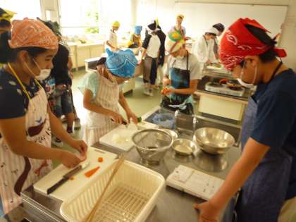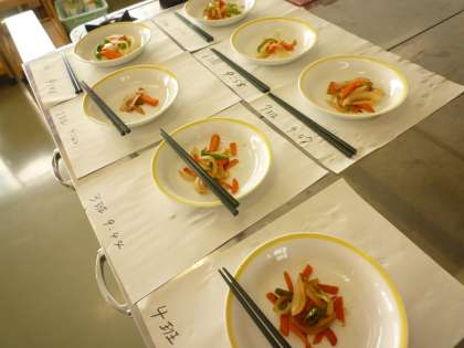野菜の切り方、炒め具合、もりつけ、手際の良さ、協力してできたかを先生はしっかりとチェックしています。