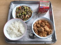今日の給食は、ごはん、じゃがいものそぼろ煮、五色あえ、柏もち、牛乳でした。柏もちには、こしあんが入っていました。おいしかったですね。